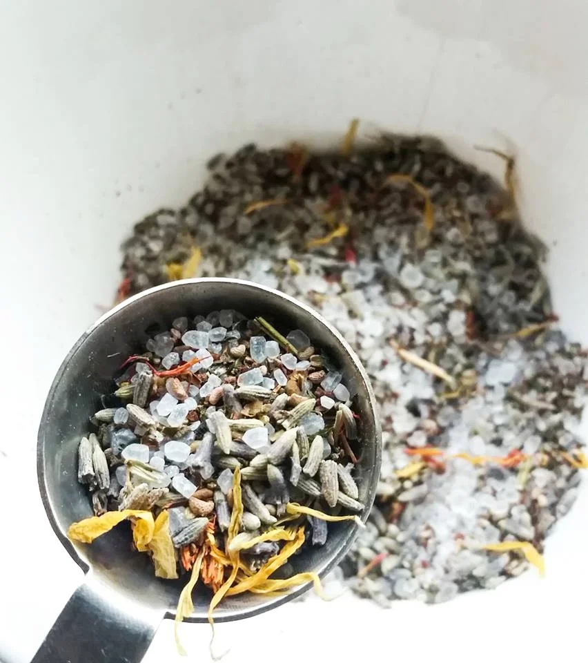 I would advise to mix the same amount of the blend and the Epsom salt which is what I did. Once mixed, it looks like a good balance. If you prefer one over the other feel free to change it up. I like having an even mix because this tea blend is super packed with goodies.