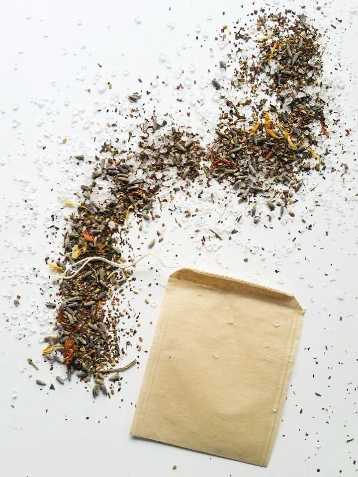 Next, you need to put this wonderful mixture in something that will allow the tea to "brew" but not make a mess in the tub. It's really easy to find tea sachets but I especially love these ones I got from For Tea's Sake because of the convenient draw string at the top of the bag!